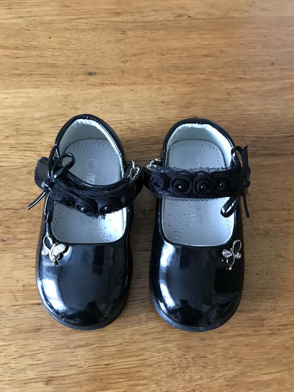 Класичні туфельки, є маленькі нюанси, на одному носик здертий і бантики в обох поздирані. В житті менш помітні ніж на фото. По устілці 13 см