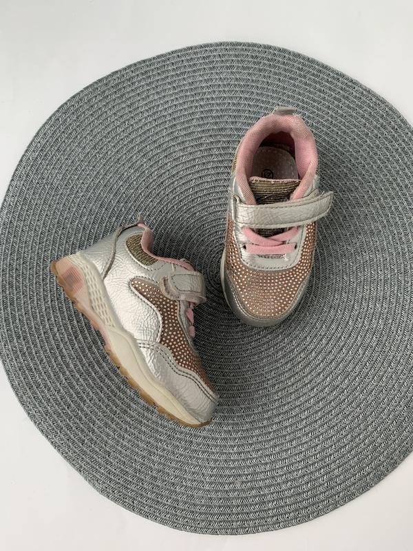 Кросівки у сірому кольорі з блискітками. Застібаються на липучці. Підошва резинова, не скользить👌🏼 шкіряна устілка. Дуже зручні та м'які Розмір: 21( 13см)