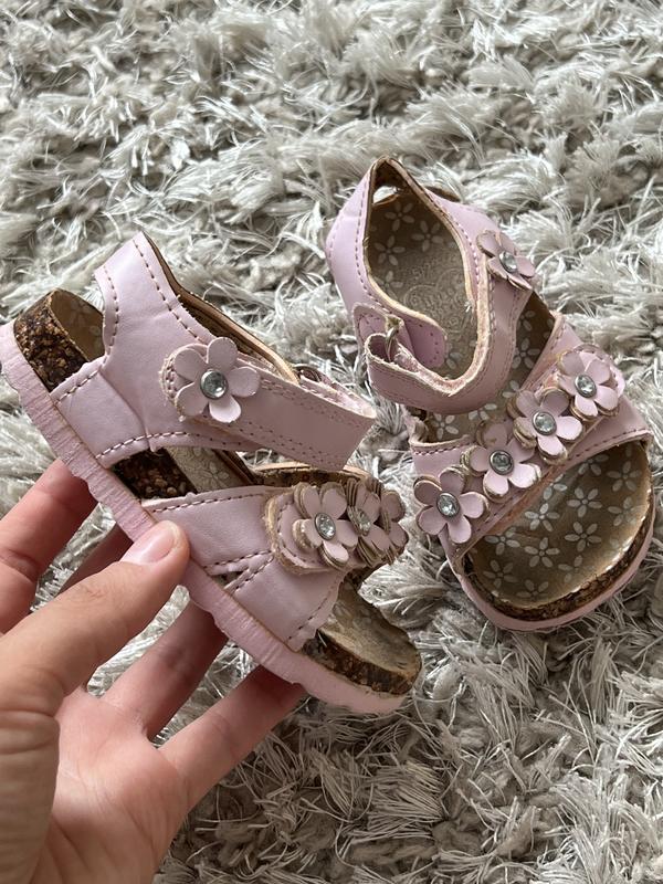 Босоножки на девочку в очень хорошем состоянии. Очень удобные, не натирали. Подошва пробковая. Стелька 12 см