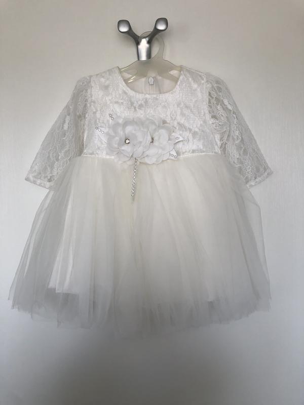 Красивое праздничное геппюровое платье. Одягнене один раз для фото Размер на 1-3 месяца (62-68) Цветочки и бант снимается В комплекте колготы, туфли и на голову ободок Колготы, туфли и ободок не были одеты На коробке цена 35$