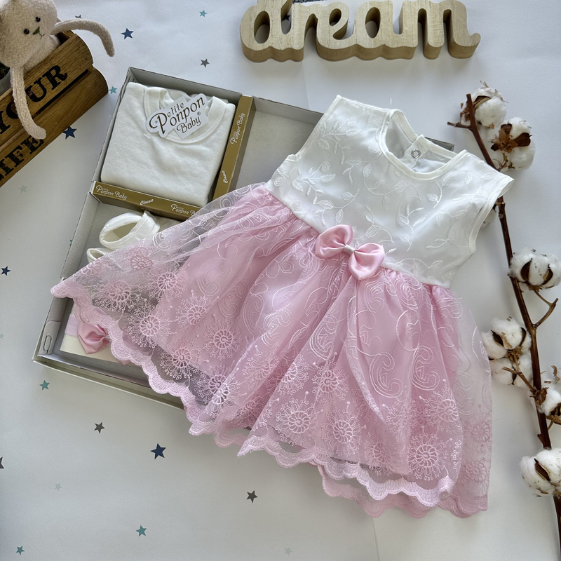 Идеальный набор для выписки, крестин, фотосессии или просто подарка. Упаковано в подарочную упаковку (коробка). Турция. В наборе 4 предмета: – платье ажур, сзади застегивается на пуговицы. – боди белый (длинный рукав) – повязка – пинетки Размер: 56- 68 см