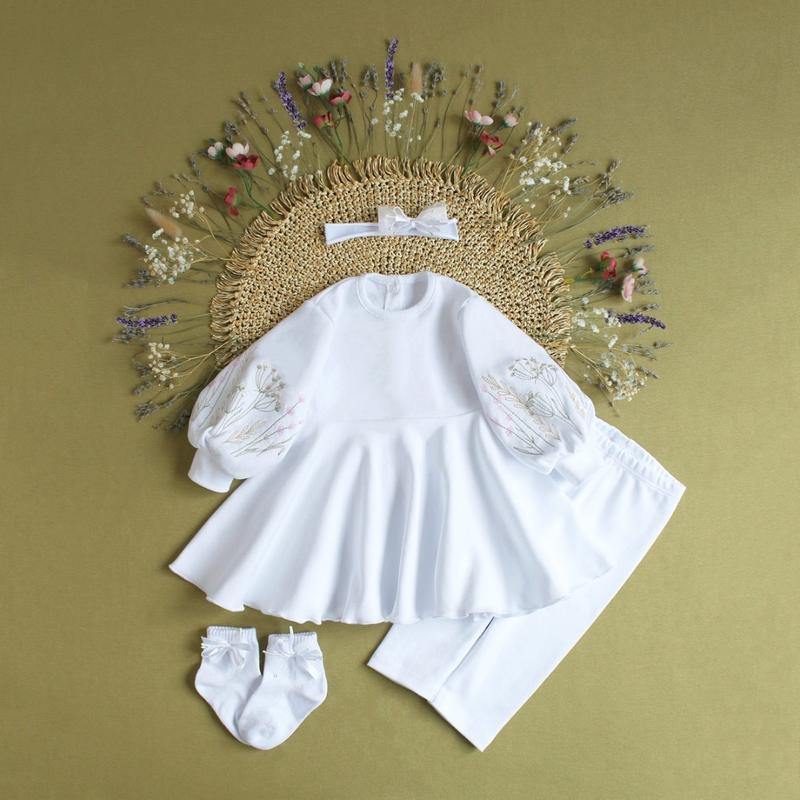 Набір для хрещення дівчинки з вишитими рукавами Ціна залежить від розміру: 18 розмір (зріст 56 см) 0-1 міс -830 грн 20 розмір (зріст 62 см) 0-3 міс -830 грн 22 розмір (зріст 68 см) 3-6 міс - 870 грн 24 розмір (зріст 74 см) 6-9 міс -915 грн 26 розмір (зріст 80 см) 12 міс - 960 грн * є заміри, дивіться останнє фото . ‼️Наявність розміру обов'язково уточнюйте! ✔️У набір входить плаття, штанята-лосіни, пов'язка та набір входить плаття, штанята-лосіни, пов'язка та шкарпетки. ✔️Одяг пошитий з натурального матеріалу інтерлок бавовна 100%. Шкарпетки зв'язані з гребінної пряжі — бавовна 90%, поліамід — 8%, еластан — 2%. ✔️Крій сукні дуже оригінальний та сучасний. Пишні рукава зібрані по низу манжетом та спідничка сонце-кльош. На рукавах вишитий букет квітучих рослин та трав. ✔️Пов'язка тоненька з прикріпленим бантиком зроблена з стрейч куліру. Вона легко тягнеться і не перетискатиме голову дитині. На шкарпетках також прикріплені бантики. ✔️Костюм зручний для обряду хрещення немовляти, є легкий доступ до ніжок, ручок, спинки та грудок. По спинці до пояса є кнопки для зручного одягання дитини. ✔️Також такий комплект можна одягнути і на інші святкові події. Це чудовий подарунок для новонароджених дівчаток.