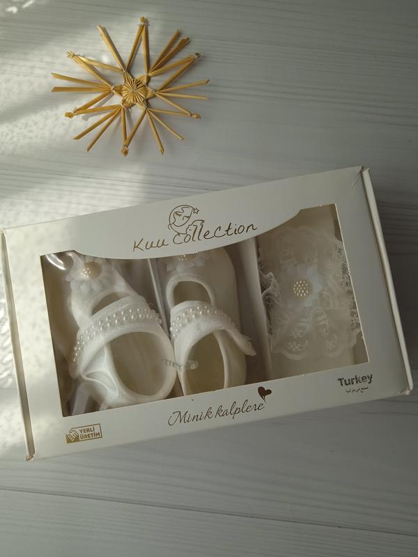 🎁 Неймовірно красивий, ніжний та чарівний комплект для хрестин, виписки або подарунок на свято🎀 🧶 Розмір: 0-4 міс В комплект входить: ✨ Ніжні пінеткі з намистинами або квітами ✨ Дуже м'яка та еластична пов'язка, з прикрасами як на пінетці
