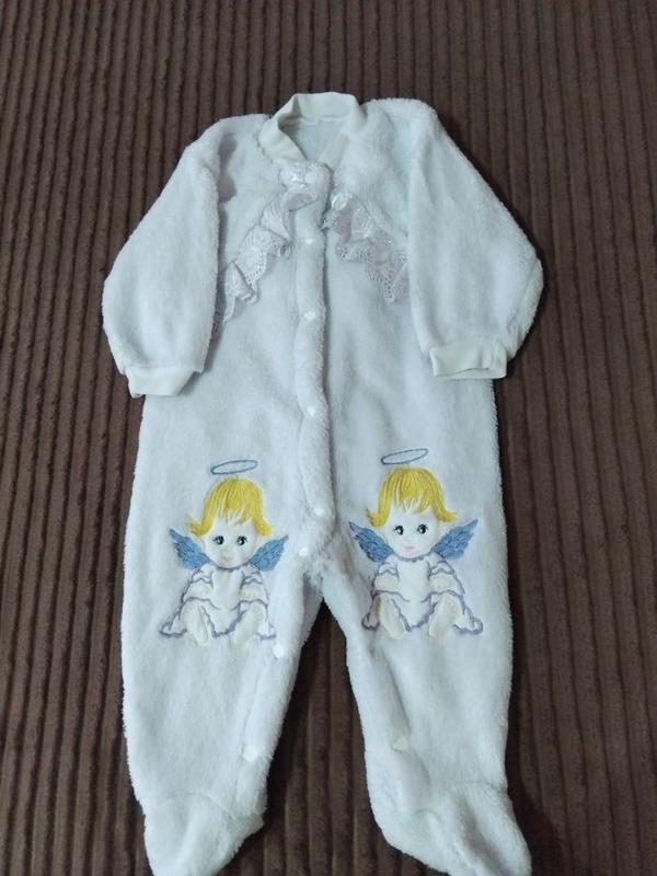 Меховой, мягкий человечек на девочку. Красивые ангелочки и оборочки.Можна надеть на крестообразование.В использовании был один раз. ЗАМІРИ Длина-58 (от верха до пяточки, без стопы). Рукав от шеи-31.