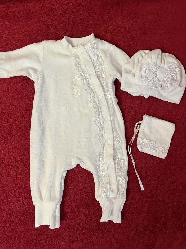 Набор для крещения велюровый( человечек с открытыми ножками, сумочка, шапка-Солоха) Шапку приобрела отдельно в комплект. Набор тепленький, одевали всего 1 раз, на перекрестие. Следов пользования нет. Купила на 1 месяц и 2 недели на крестостно.