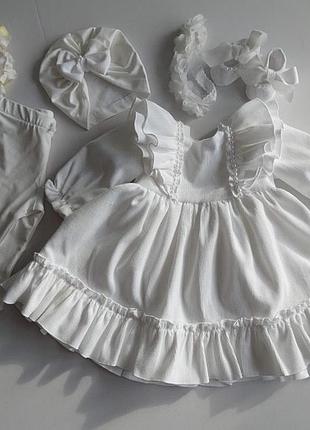 1. Платье вельвет айвори с бусинами 2. Чалма с бантиком 3. Пинетки с лентами и бусинами 4. Лосины 5. Повязка Голова 37 Пит 41 Груди 38 Длина 38 Стопа 8 Запас