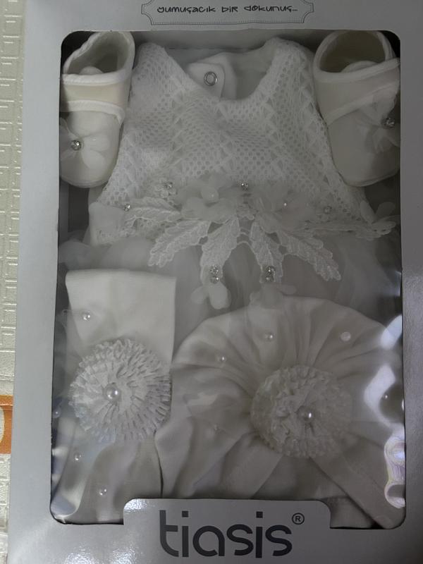 Набор для девочки на крестостное или праздник В набор входит: платье 0-3месяцы, пенеточки, шапулька и повязочка Ободваривался один раз Набор стоил 1400 Ввідам за 600 Производитель Турция