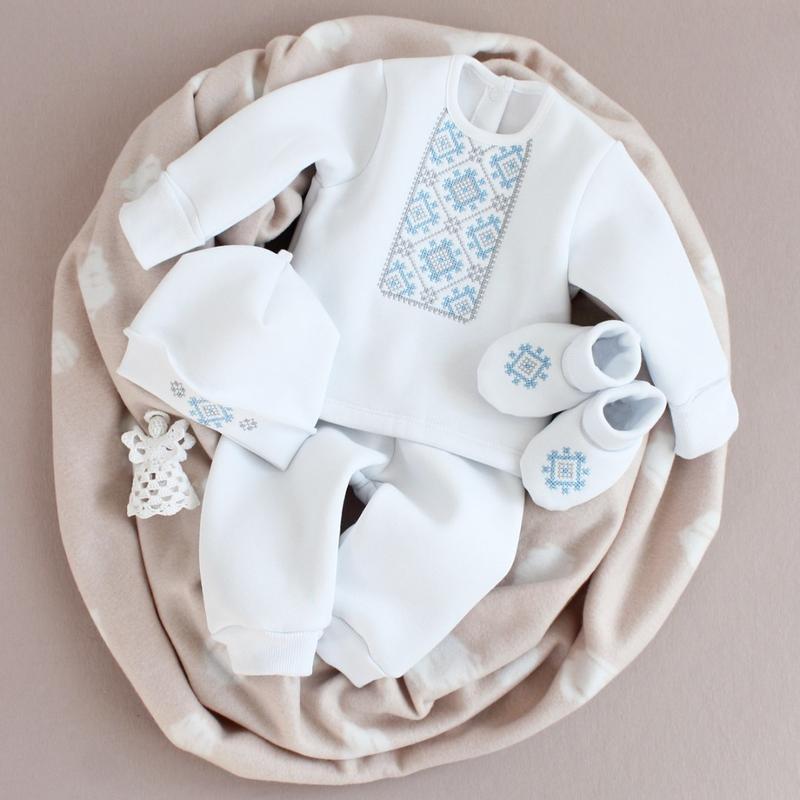 Теплый костюм для крещения мальчика Данный набор на флисе очень хорошо подойдет для демисезонной поры или на зиму. Он включает кофточку с застежкой на спинке малыша, штанята на манжетах, шапочку со швами наружу и пинетки. Машинная вышивка голубыми и серыми нитями. На рукавах есть возможность закрывать ручки младенца. Изготовлен из качественной ткани трехнитка, хлопок - 90%, ПЭ - 10%. Внешне гладкий с вышивкой, а с середины начес. Плотность материала 280 г/м2. Удобный для крещения Все необходимое в одном наборе