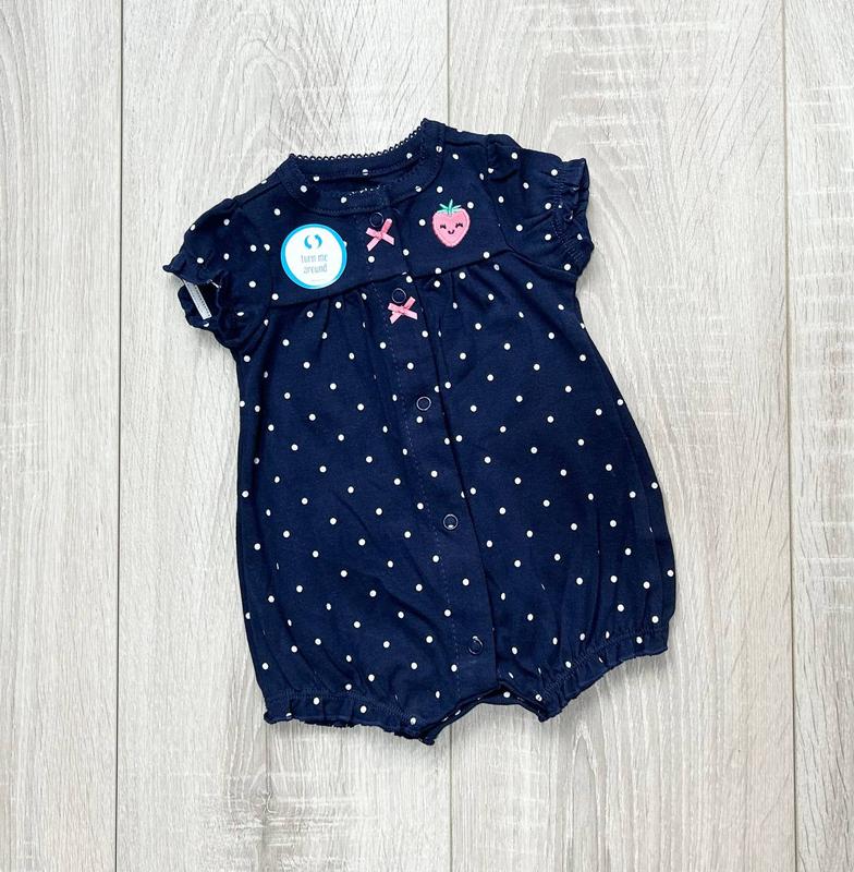 Яркие и удобные песочники для девочек. Насыщенного синего цвета в горошек с нашивкой клубнички на попе и маленькая клубничка на груди. Застегивается на кнопки по всей длине и снизу кнопки для смены памперса. Состав: 100% хлопок. размер NB на рост до 55 см Carters - детская одежда высокого качества. Ткань не линяет не вытягивается и не выгорает. Рассчитана на продолжительное ношение одежды для Вашего ребенка.