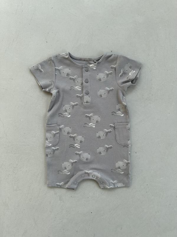 Серого цвета ромпер с китами. Размеры в наличии: 6-9 мес.