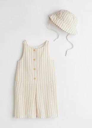 Комплект із комбінезоном без рукавів і капелюхом від сонця з бавовняного плетіння з візерунком. Комбінезон із застібками спереду, накладними бічними кишенями та широкими прямими штанинами. Частково підкладений. Шапочка із зав'язками під підборіддя. ♥️9м /74 ♥️9-12 м/80 ♥️2 роки/92