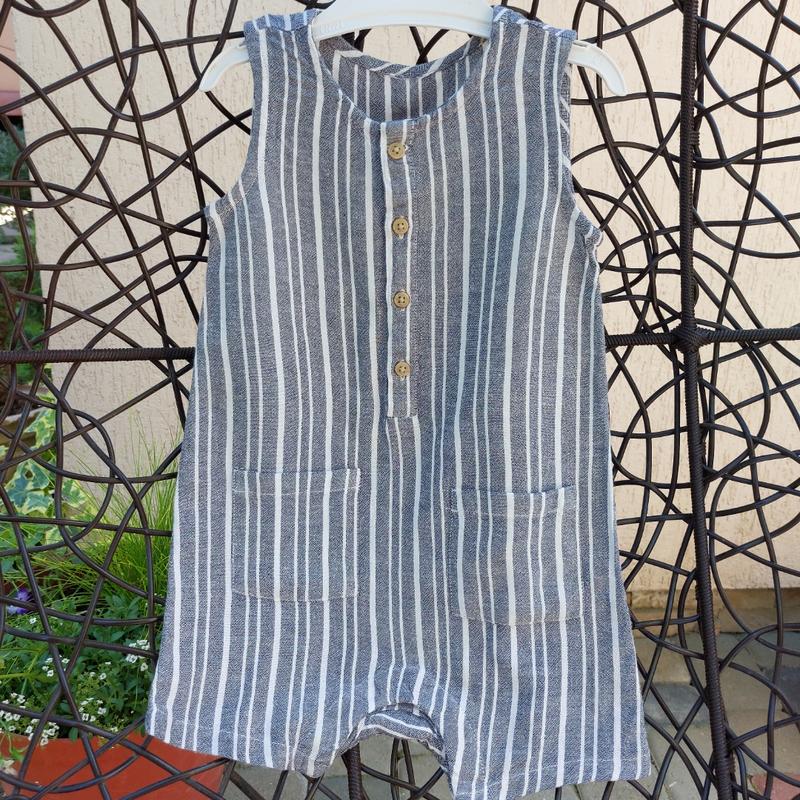 стильный, сверхудобный коттоновый ромпер шортиками, легкий, который не будет парить, ткань люкс. состояние: отличный отрезанная бирка,то точно неказано какой размер, но ориентируйтесь на замер! от плеч до посадки памперса 46см, в груди 28см размер: 12мес.