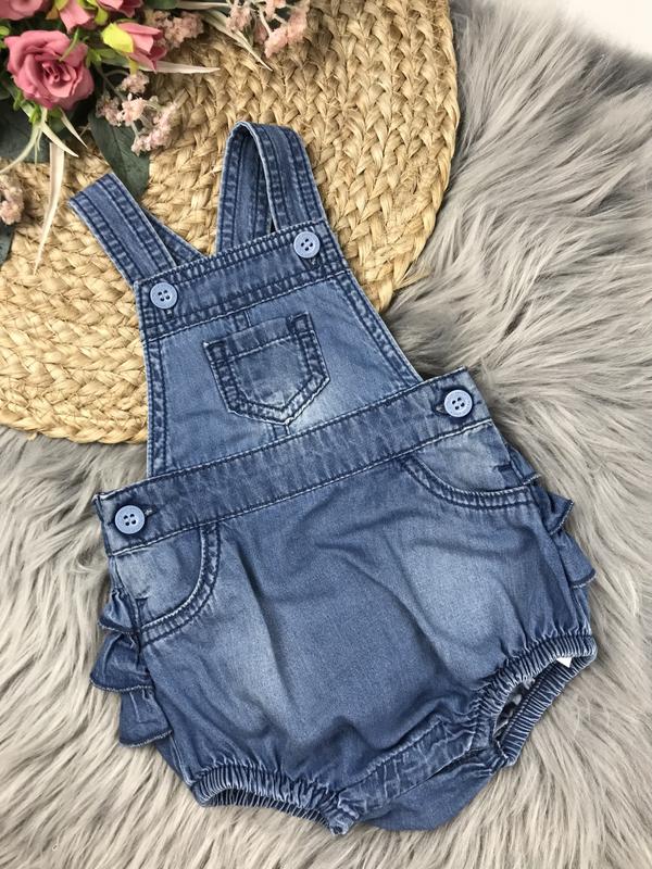 ⬇️ Опис ⬇️ Якщо Ви бажаєте придбати більше однієї речі, будь-ласка, оформлюйте замовлення через кнопку «Додати до кошика» ✅ Джинсовий комбінезон з рюшами на попі 0-1 міс, в ідеальному стані. Довжина бретелей регулюється додатковим ґудзиком. Літній джинс, тоненький. Довжина від плеча до підгузка максимум 40 та 41 см., Ширина по талії 22 см. Посадка 23 см.