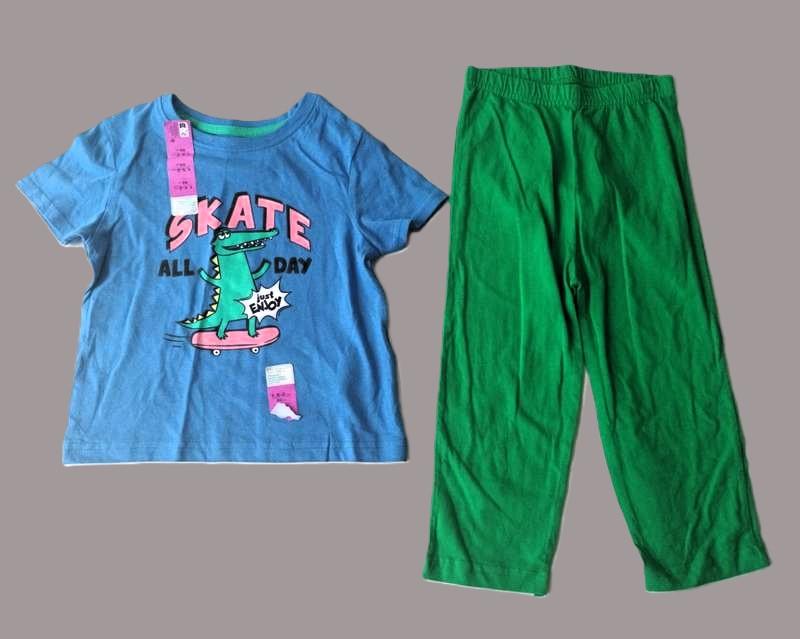 кобинированная без упаковки верх: 1,5 -2 года, 92 см Сделано в Индии 100% хлопок ПОГ 30 см, длина 35 см. Низ: 1,5-2 г 92 см 100% хлопок ПО резинки 23 см, длина по внешнему шву 51 см, шаг 31 см, ПОБ 30 см