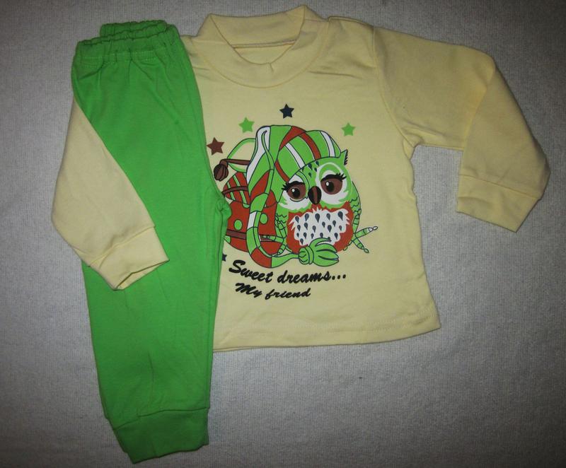 Детская пижама кофта и штаны: Кофта с круглым вырезом горловины и длинными рукавами с манжетами-резинками, красивым принтом "Сови" Материал: 100% хлопок (интерлок) пижама (реглан желтый + штанишки зеленые) рост 74,80 штанишки: длина 43 см, шаг 27 см; реглан длина 33 см., длина рукава от плеча 28 см,, полуобхват груди 28см. Состав: 100% бавовна Доставка: Нова пошта, Meest, Укрпошта Доставка за Ваш счет.