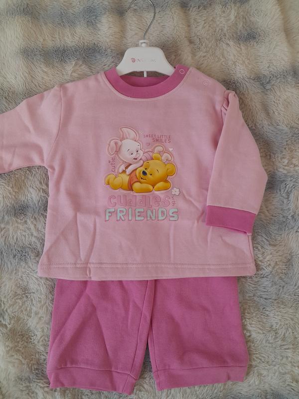 Милая детская пижамка для девочки. Состоит из кофточки длинный рукав и штанишек. Выполнен в нежно-розовых тонах. На кофте изображены герои Винни Пух и Пятачок с надписью “Sweet Little Smiles, Cuddles Friends”. Есть кнопочки у горловины для удобства одевания. Материал мягкий и приятный к телу – идеально для ежедневной носки.