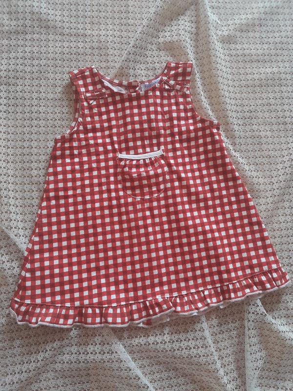 Трикотажна сукня в клітинку на гудзиках Klitzeklein Нова, з етикеткою Сток, може мати запах обробки, піде після прання 100% бавовна, товстенька, не легка, двошарова - верх більш гладкий, а зсередини м'якша Яскрава червона клітинка По низу оборка, на грудях кишенька, ззаду гудзики Дуже гарна якість Розмір 80см на 10-12місяців Довжина від плеча 43см, плечі 22см, під руками 30см, по низу 45см