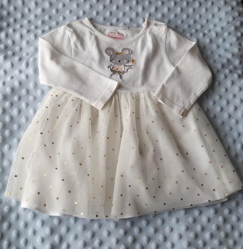 Сукня Bluezzo для дівчинки 6-9 міс. (74см; 9,5 кг) 100% бавовна Довгий рукав, поверх нашита 2-шарова спідничка-сіточка. 2 кнопки-гудзики біля шиї для зручного одягання. Рукав від плеча 24 см, довжина по спинці 37 см