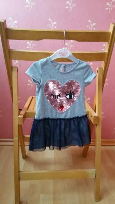 Стильне платтячко в паєтку на дівчинку 9-12 міс. з серцем в паєтки. Колір серця змінюється, коли по ньому проводиш. Стан нового