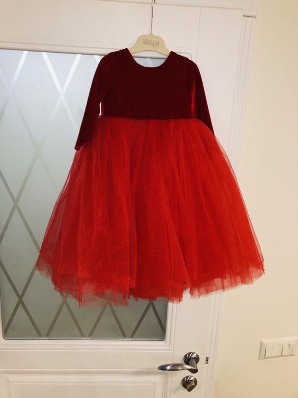 Платье до девочки - верх бархат, низ Фатин. Одето один раз- состояние нового.Бант на кнопках съёмный. Шили на заказ по замерам- Объём груди -49 Длина по спине -64 Длина рукава-24