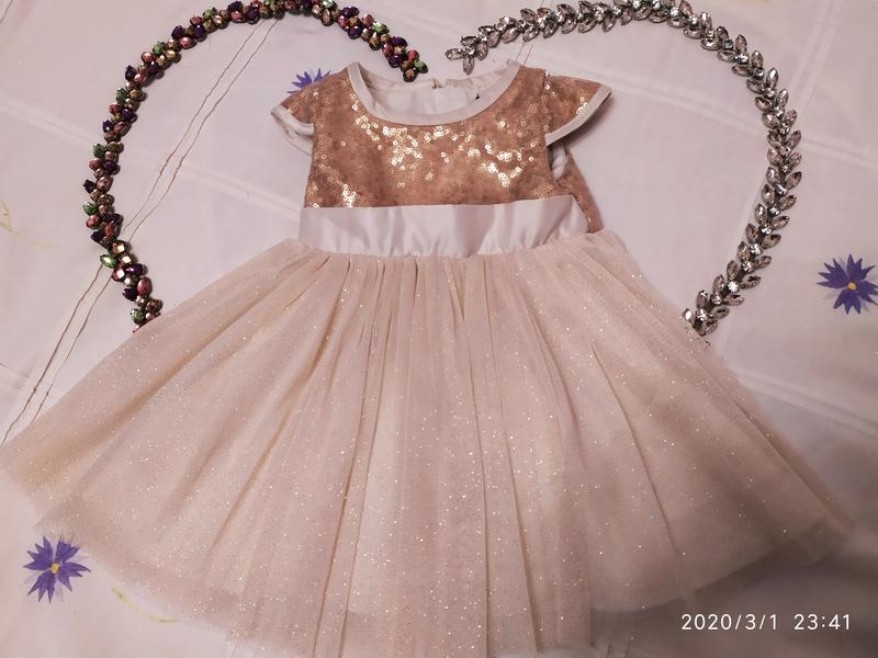 шикарное нарядное платьице для малышки ,можно на крестины или фотосессию ,внутри подкладка очень приятная к телу нигде не колет ,верх паетки низ фатин ,на спинке до низа талии молния,длина 38 см высота топа 14 см в груди 24 см ,одето раз ньюансов нет
