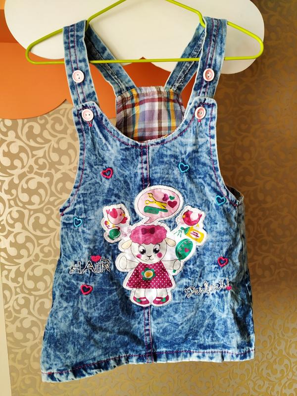 Сарафан джинс котон, новый, размер указан 3года, но маломерит. Замеры: длина макс.47, можно перестегнуть до 45 см; пог 26 см.