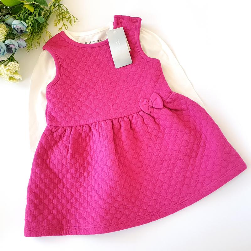 Милый комплектик состоит из белого реглана и плотного платья,размер указан 6-9 мес. реглан(длина 32, ПОГ 24,5,рукав от плеча 25) платье (длина 42,5, ПОГ 26)