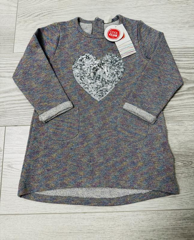 Нове плаття для дівчинки від Cool club Польща. 86 розмір, 18-24 міс. Тканина з різнобарвною люрексовою ниткою (70% котон, 25 % поліестер, 5% паєтки), всередині «петельки». Серце з паєтками, ззаду на гудзиках. Заміри є на фото.