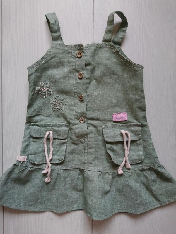 Сарафан в ідеальному стані На вік 12 місяців і ріст 74 см Спереду на гудзичках Матеріал 55% льон і 45 котон Довжина 42 см Півобсяг грудей 25 см