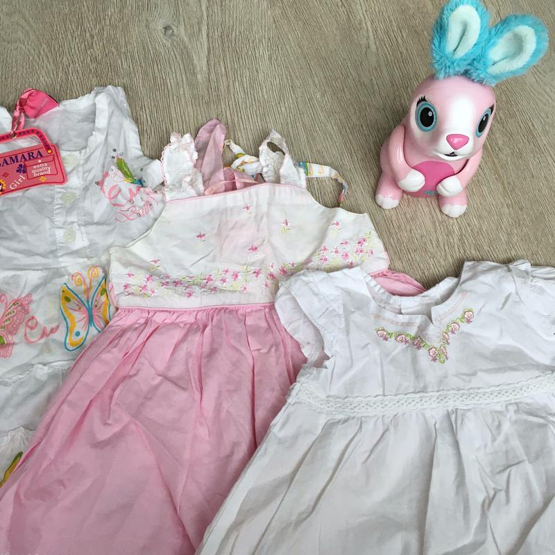 Летние платья на девочку 2 года. Состояние очень хорошее, на белом снизу есть пятнышки(выводить не пробовала). С бабочками на худенькую девочку. Цена за три