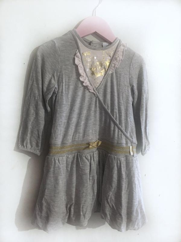 Платье светло-серого цвета трикотажное, юбка колокол. Мягкое. Состав ткани 95 % хлопок, 5% эластан. На поясе резинка с люрексом. На груди вставка с пайетками.