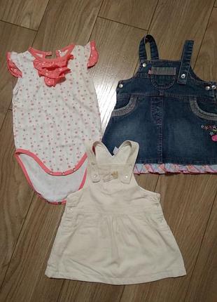 Всі речі в ідеальному стані. Боді пише на ріст 80, заміри : довжина - 43 см. Сарафан джинсовий: довжина - 41 см, ширина -28 см. Сарафан вельветовий, молочний, на підкладці: довжина- 40/42 см, регулюється гудзиками, ширина-27 см. Носили з 8 міс до 1.5 року. Ціна за все.