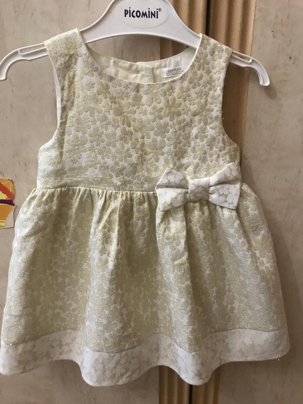 Платье в отличном состоянии с золотистой вышивкой, имеет котоновый подклад. Длина-42см, плечи-18,5см.,талия( под грудью)- 25см.