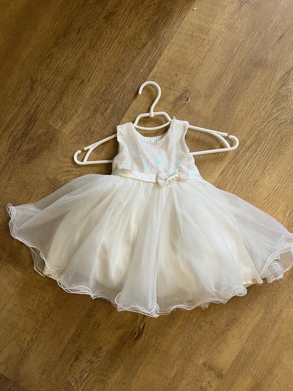 Пышное нарядное платье для малышки . Размер указан на годик , но можно надеть и чуть раньше , и в 1,5 годика тоже . Внутри хлопковая подкладка , чтоб малышку не кололо ) сзади красивый бант и прозрачная вставочка сердце . Мы пробовали надевать и под бодик белый , так же очень хорошо смотрелось 👌🏼 Без пятен и дефектов , легко отстирывается . Очень пышное , и при этом удобное !) малышка бегала в нем свободно )