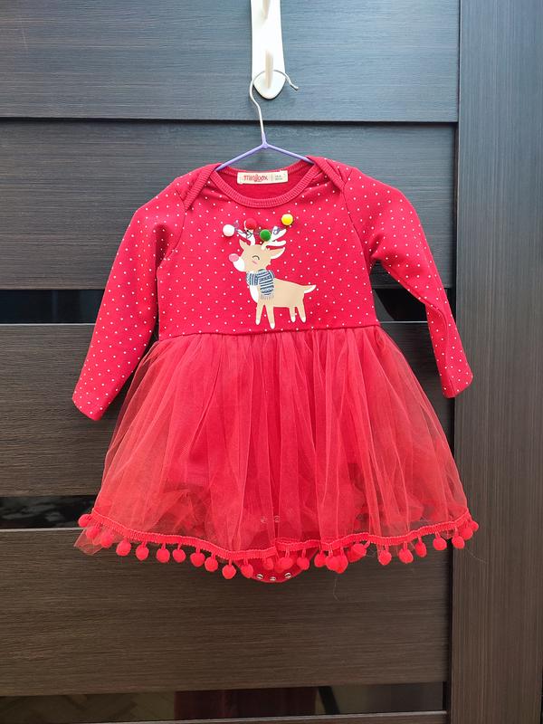 Плаття як нове, одягалося один раз на фотосесію на одну годину. Не пралося, не прасувалось. В комплекті нова пов'язка на голову з оленем Заміри розмір 80 Довжина боді - 42 см, ширина - 24 см, довжина рукава від плеча - 26,5 см