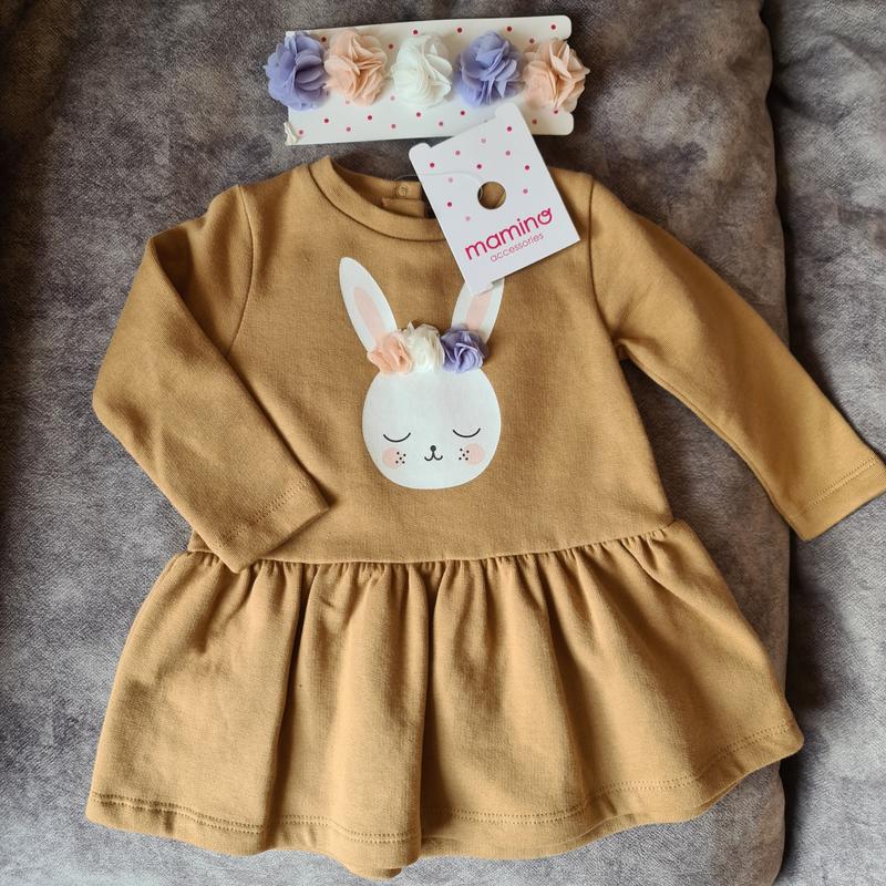 Милое платье с зайчиком стильного горчичного цвета. В комплекте с повязочкой. ⠀ ▪️Цвет: горчичный ▪︎На легком флисе ▪️Материал: 100% хлопок; ▪️Размер по сетке: 6-9 месяцев 9-12 месяцев.