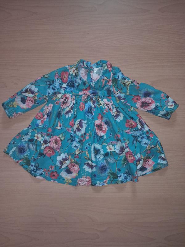 Яркое платье на 6-9мес. Длина39см, плечи 17см, ширина подмышки 25см., рукав от плеча 25см.Очень красивый принт.На спине пуговицы, удобно надевать.