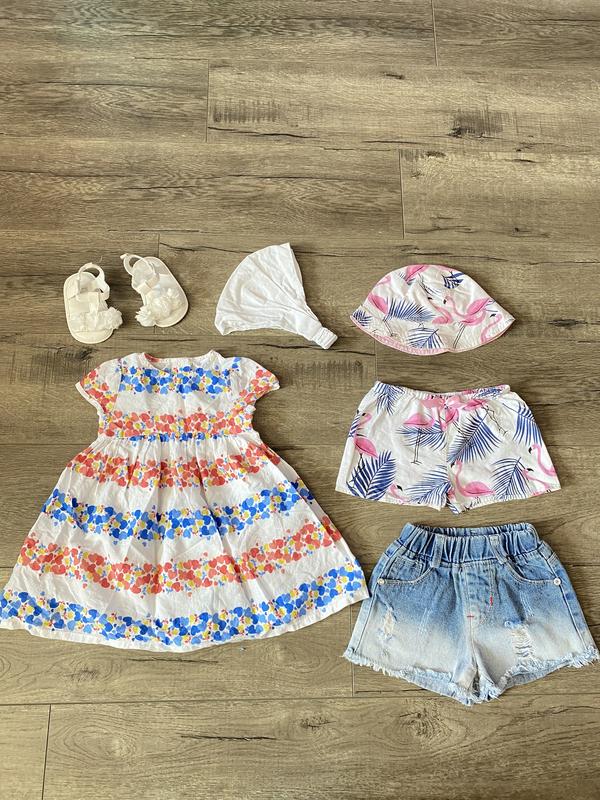 Набор вещей на 6-9мес Легкое платье с косинкой, шорты с панамкой (двухсторонняя), джинсовые шорты с бахромой, базовые босоножки от картерс Цена за все: 485грн Размер: 3-6мес Стан: нових речей, одягали по 1 разу Больше фото каждой вещи пришлушь при прочне natashka.vylychuk