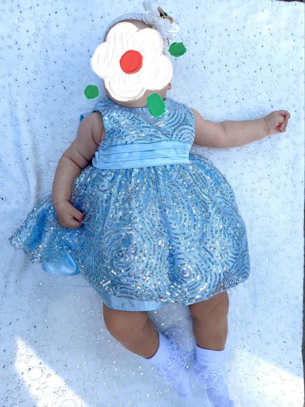 Голубое платье с трусиками на памперс.Обшитое пайетками,ззади бантик.По наборке 12 месть,но реально на 3-6 месяцев.Одежды 1 раз на фотосессию, темное состояние отлично
