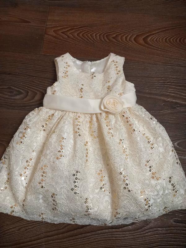 Платье Cinderella для маленькой принцессы, новый,цвет шампань, в пайетках, ткань атлас и гипюр, пайетки, хорошо держит форму, по бирке 18 мес Пояс по бокам пришит, сзади собирается в бант длина платья 42 ширина в груди 26 от горловины до талии 13 (завышенная талия) длина шорт 23 ширина 33 ризинка в поясе 17 (тянется до 30) ножки ризинка 13 (тянется до 18)
