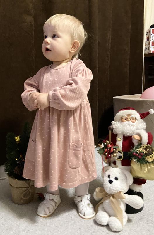 Продам наше платье Next 12-18 мес. На фото своей дочурке год и 1 мес. Рост у нас 75 см. Хлопок, но не тоненький. Одевали 2 раза - на рочек и вот на фото с елкой.