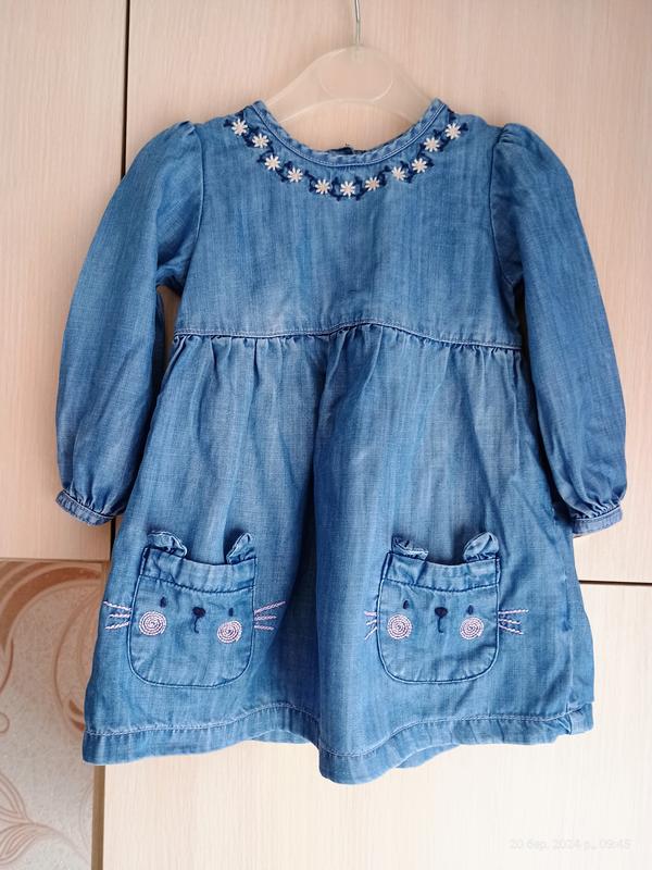 Джинсовое платье с вышивкой, платье 9-12 мес! Длина 43 см, рукав 27 см!