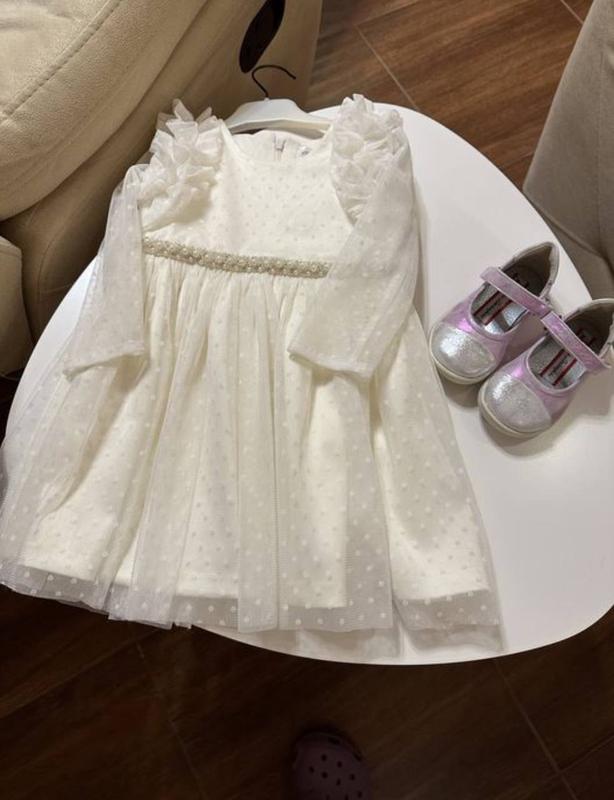 В ідеальному стані. Купувала на святкування 2 річчя. Зріст дитини орієнтовно 82 см. Буде і на більший зріст. Заміри: довжина 49 см, довжина рукава 28 см, ширина в грудях 26 см, ширина в талії 25 см. Бант зйомний на зручних кнопках. Надзвичайна якість та краса.