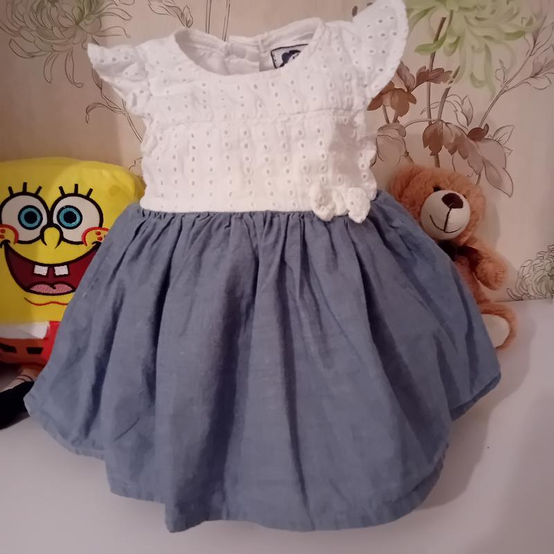 Платье,на возраст от 0 до 3 мес.Гарно сшито,сверху прошва,низу тонкий джинс,и белый подюбник,пишное, легкое.Длина спереди 29,ширина под ручками 21.Цина 105 гр.Фиррма early days.