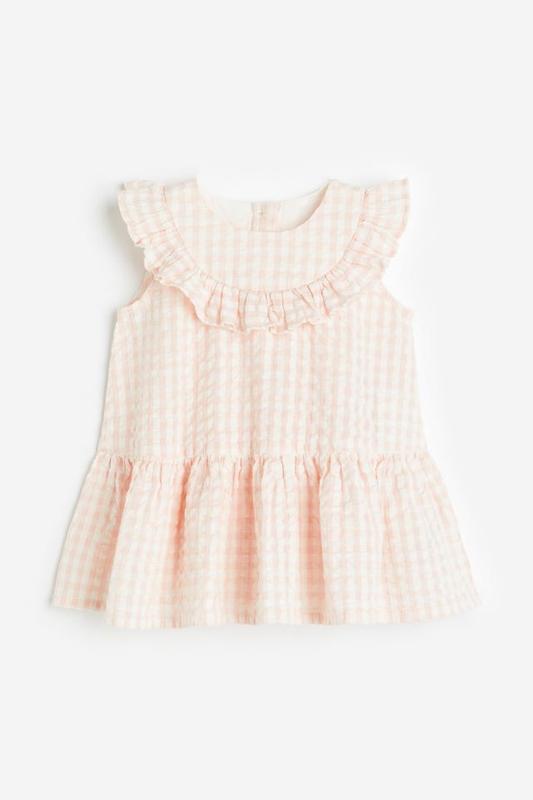 Сукня без рукавів з бавовни. Кругле декольте, розріз на шиї з ґудзиком з імітації дерева. Шия з воланами, що тягнеться на плечі. Супер мила дівоча сукня. Розмір : 86