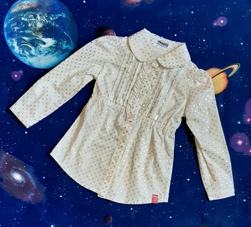Очень красивое нарядное платье-рубашка бренд Primigi Италия цвет айвори в серебряный горошек, рукава подварачиваются на пуговицу на девочку 1,5-2 лет ЗАМЕРЫ длина от плеча до талии/низа 18/40 см, ПОГ 27см, ПОТ 23/27 см, рукав 33см, плечи 22см 88