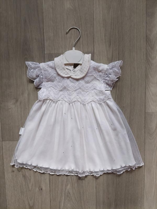 святкова біла сукня на дівчинку 6- 9 місяців. є дефект: маленька дирочка на фатині (на останьому фото вказала) її не дуже помітно і з самої спідниці облетіло більшість блискіток.