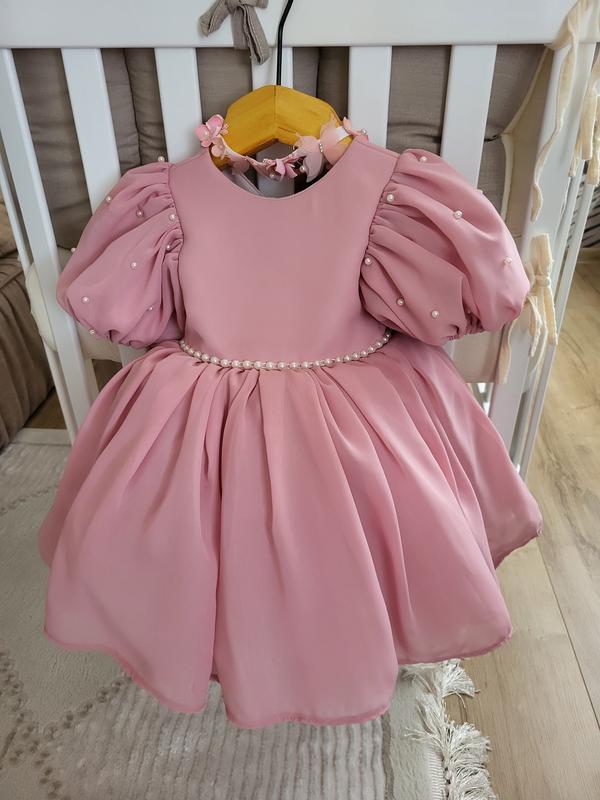 Красива сукня для дівчинки. Пошита на такі параметри - обхват грудей і талія по 47 см. Підійде на ріст 74 см і 80 см. Довжина 50 см. Одягали 1 раз на рік. Стан нової, також є пов'язка на голову та взуття.