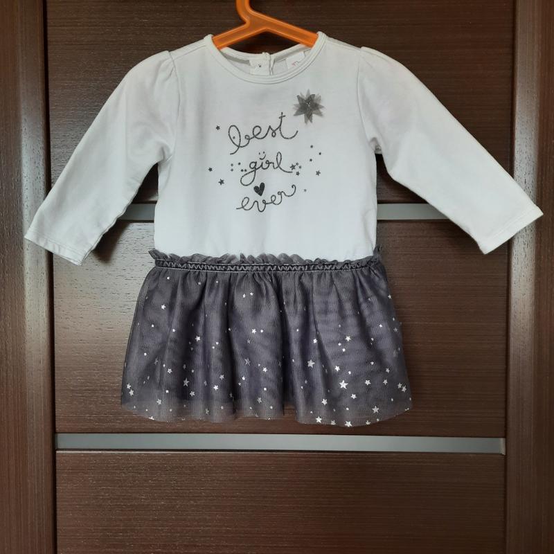Платье Baby club 80см на флисе с юбочкой из фатина, украшения мерцающими звёздочками и надписью "Лучшая девочка во все времена". Состояние отличное, но есть небольшой дефект - последнее фото плечи 21 рукав 26 ПОГ 28 Длина по спинке белое 23 Длина юбочка 17