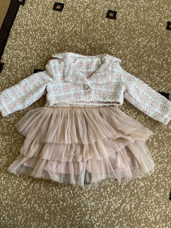 Платье детское, размер не указан, мы носили в 2 года. Длина платья 52 см, обхват 64 см, длина рукава 33 см. Ткань жаккард и юбка платья фатиновая. Ребенок оделал платья два раза, поэтому практически новое. Подойдет на 92 размер
